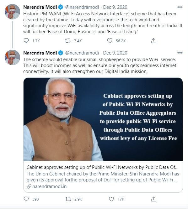 “The scheme would enable our small shopkeepers to provide Wi-Fi service. This will boost incomes as well as ensure our youth gets seamless internet connectivity. It will also strengthen our Digital India mission,”